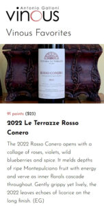 Sul rinomato sito americano di cultura enologica Vinous, fondato da Antonio Galloni, il wine taster Eric Guido ha selezionato Rosso Conero 2022 fra i “Vinous Favorites”, nell’edizione di settembre 2025.